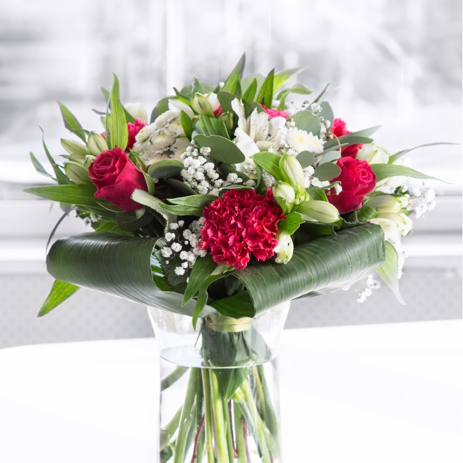 Discover a bouquet that radiates elegance and creativity. Our arrangement is a perfect medley of white chrysanthemums, airy gypsophila, striking red roses, and delightful carnations, artfully enhanced with white alstroemeria and bold aspidistra leaves. This luxurious display is crafted to leave a lasting impression.