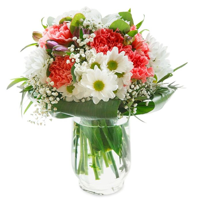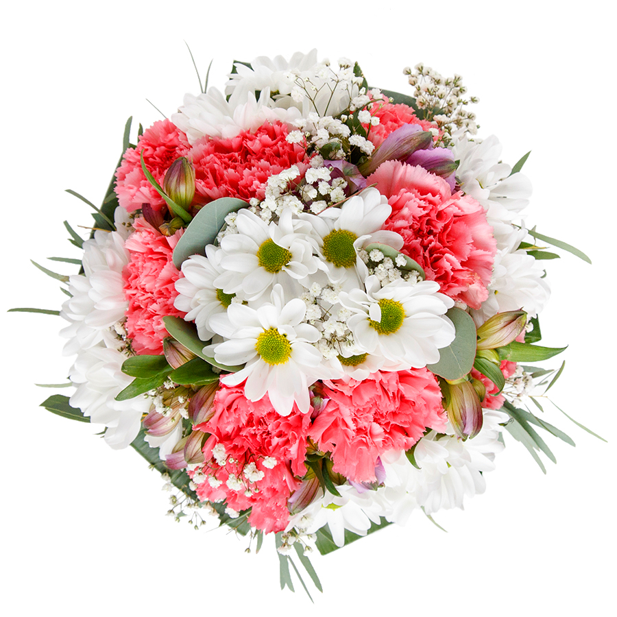 Embrace the art of gifting with our luxurious floral arrangement. This bouquet dazzles with a harmonious blend of pristine white chrysanthemums, charming gypsophila, and gentle light pink carnations nestled among vibrant aspidistra leaves.